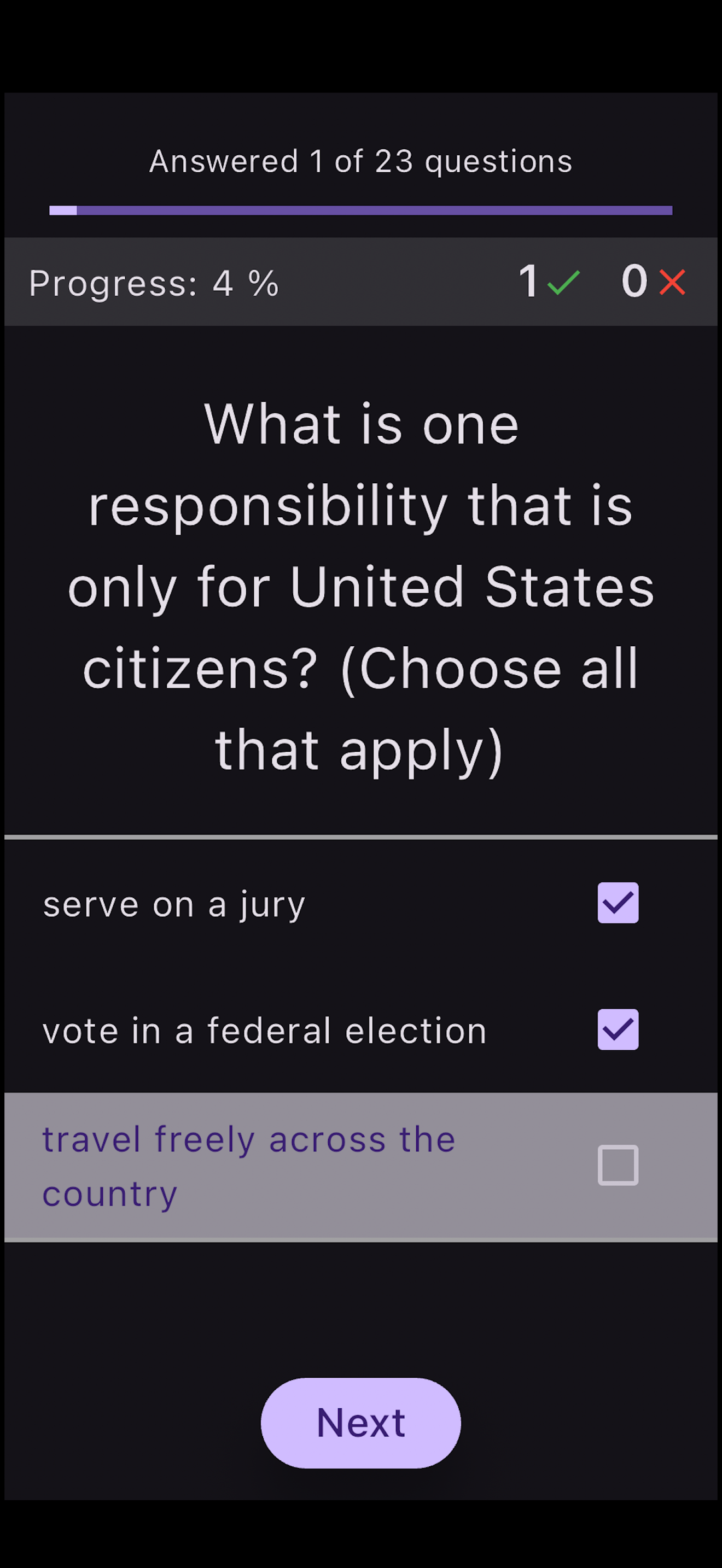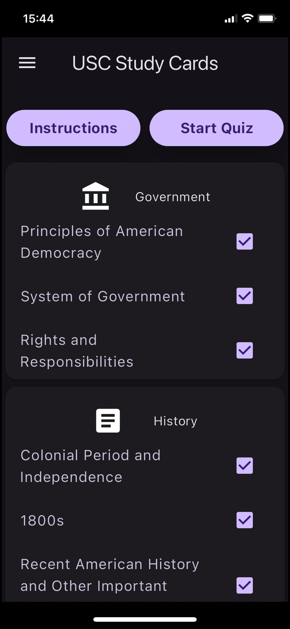 Facing a mountain of 100 questions for the US Citizenship exam can feel overwhelming, right? Fear not! Our app is here to make your study sessions a breeze. With the "Choose What to Study" feature, you can easily break down the study material into manageable sections. This means you get to focus on mastering one area at a time, making the whole learning process more efficient and a lot less daunting. Ready to tackle your studies with confidence? Dive in and select your section!